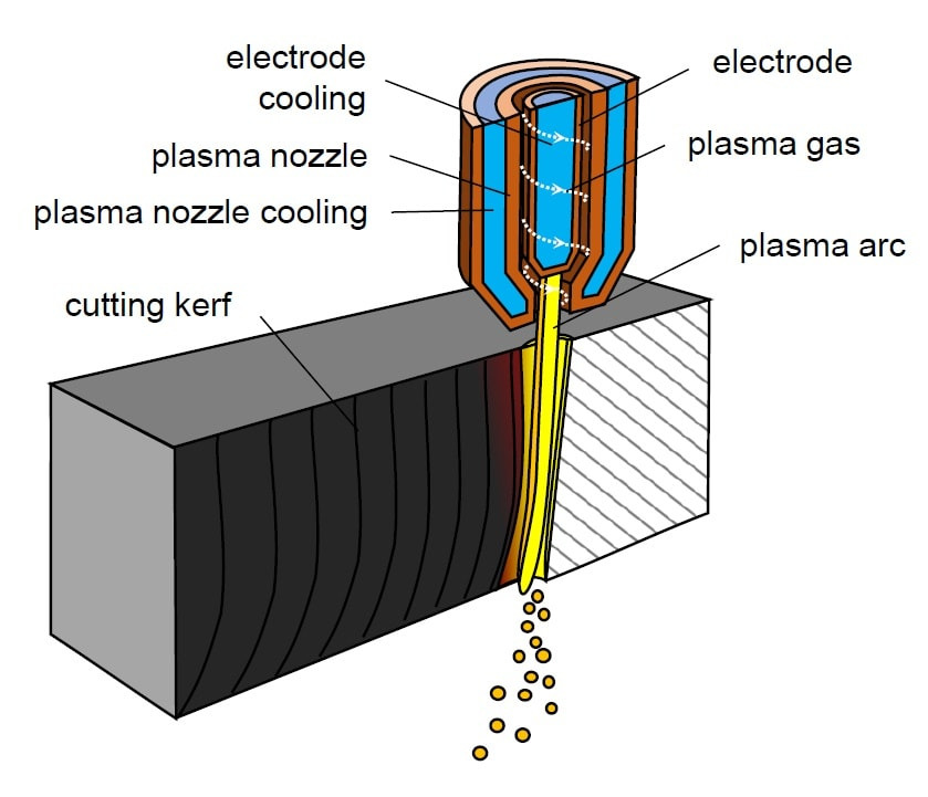The nozzle narrows the high velocity jet which directs high thermal energy on a particular area of the workpiece. This heat increases the metal’s temperature very fast beyond its melting point. Also, the kinetic energy of plasma helps in breakdown of atomic bonds and this facilitates the material’s conversion from solid to liquid. Because of melting, a thin kerf is produced that assures accurate cutting.
