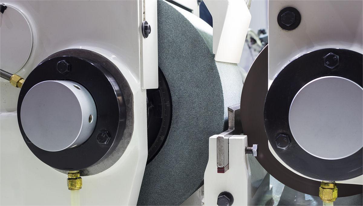 Two wheels which rotate in sync but at different speeds, are the basis of this process. The main grinding one is stationary and the regulating wheel is adjustable for pressure. Between the wheels is a work blade platform which supports the workpiece.