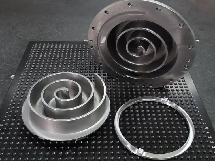 Fabrication process starts with precision casting to create the spiral body of the scroll. Choice between ductile iron and aluminum‐silicon alloys depends on targeted application. Casting produces a near‐net shape which minimizes material waste.