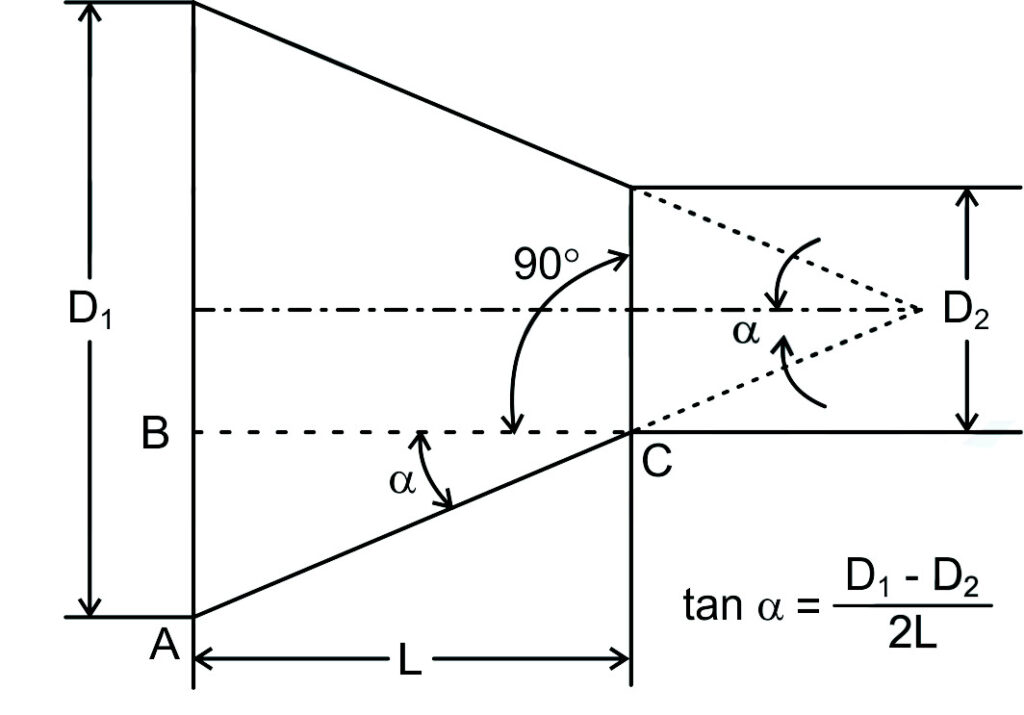 To find the taper angle (α), use this formula: tan α = (D-d) / 2L. In this case “D” is the large diameter, “d” is the small diameter, and L is the taper length.